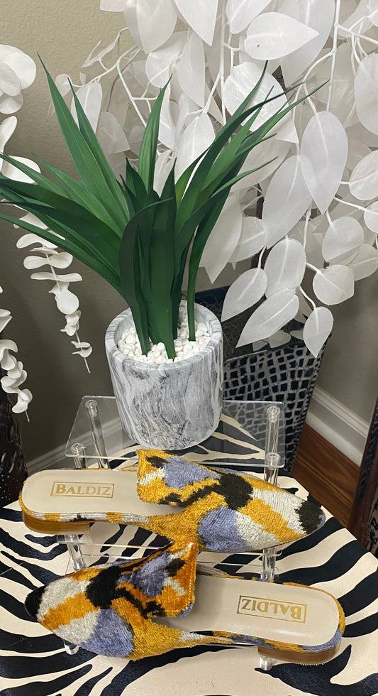 Handcrafted Ikat Velvet Silk Pointed Flat Mules for Women