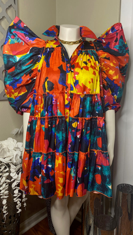 Love Abstract Print Exaggerated Puff Sleeve Dress